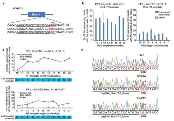 在本研究中,研究人员利用PE系统,对人类并指畸形相关基因HOXD13的两种碱基颠换突变,并在小鼠上找到其同源突变,针对这两种突变进行编辑。通过对编辑效率进行优化,,利用显微注射方法获得了携带人类同源突变的子代小鼠,携带目标突变的比例高达27%。该研究首次利用引导编辑系统创制了动物模型,验证了该系统在动物基因编辑上的有效性,为下一步在家畜等大动物中开展基因编辑育种工作提供了重要技术支撑。