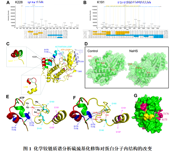 该研究对干旱响应关键蛋白SnRK2.6的两种蛋白质翻译后修饰进行研究。利用化学铰链质谱(Chemical cross-linking coupled with mass spectrometry)技术分析S-硫巯基化修饰改变蛋白结构。C131/137位点的S-硫巯基化修饰会导致SnRK2.6激酶活性环结构发生变化。在S-硫巯基化修饰状态下,位于激酶活性环结构的关键磷酸化位点S175会接近ATP-γ-phosphate基团传递位点D140,导致γ-phosphate基团传递效率提高,最终积极调控SnRK2.6的分子内磷酸化能力。