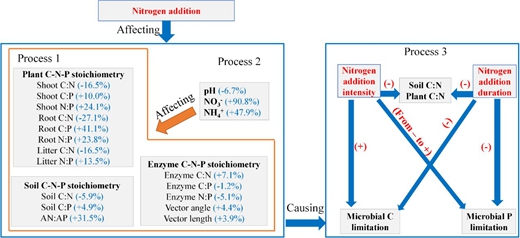 大气氮沉降显著影响生态系统中的养分循环和C-N-P化学计量。然而,全球尺度氮添加对植物、土壤和微生物C-N-P化学计量的影响尚未进行定量化研究。该研究基于全球164个地点的898个氮添加实验数据结果,综合分析了氮添加对不同生态系统类型(农田、草地和森林)植物、土壤和酶C-N-P化学计量和微生物养分限制的影响(图1)。