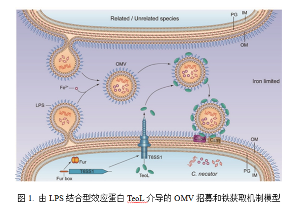 细菌外膜囊泡OMV是革兰氏阴性细菌在生长过程中形成的一种囊泡状结构。作为一种生物纳米材料,外膜囊泡不但在介导微生物群落间的相互作用中扮演着重要的角色,同时在疫苗研发、肿瘤免疫治疗和靶向纳米药物递送载体方面具有广阔的应用前景。然而,由于目前对于细菌如何识别和招募OMV仍所知有限,限制了当前对OMV生理生态功能的进一步深入认识。本研究中,研究者发现杀虫贪铜菌Cupriavidus necator中的六型分泌系统T6SS-1可分泌一个独特的LPS结合型效应蛋白TeoL,通过与OMV表面的LPS相互作用而结合到OMV表面;结合到OMV上的TeoL进一步通过与细菌外膜受体蛋白CubA和CstR的相互作用,介导OMV结合到细菌细胞表面,并最终实现对OMV中包括铁离子等货物的获取。通过招募OMV以获取其中的铁是一种新型细菌铁获取方式,深入研究这种铁获取方式不仅对于细菌铁转运领域有重要意义,并将为揭示细菌通过招募OMV获取其它营养物质和信号分子的机制带来启示。此外,这种通过识别OMV表面LPS进行招募的机制使相应细菌在微生物群落中能获取来自不同物种的OMV,从而赋予其在细菌种间竞争、抗氧化胁迫和基因水平转移等方面的生长和进化优势。