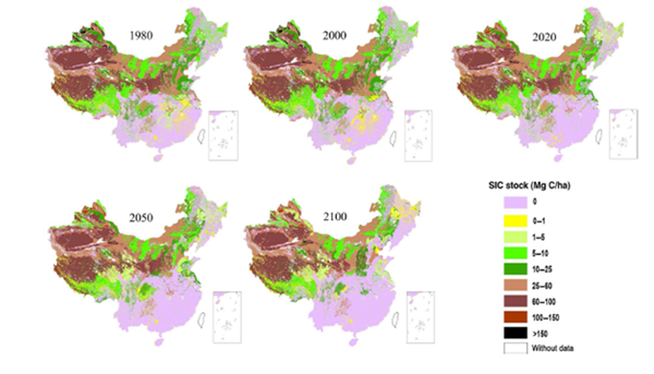 图1施用氮肥及氮素沉降对我国农田0-40 cm土层无机碳含量的影响及预测